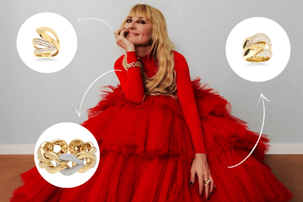 Cayetana, actriz, presentadora de televisión y periodista, también optó por llevar un conjunto de Joyería Grau. Esta vez con más piezas, el cual estaba formado por una pulsera en forma de cadena de oro amarillo de 18k y pavé de diamantes blancos, junto con dos anillos de oro amarillo con diseño de cadena y con los mismos materiales que la pulsera.