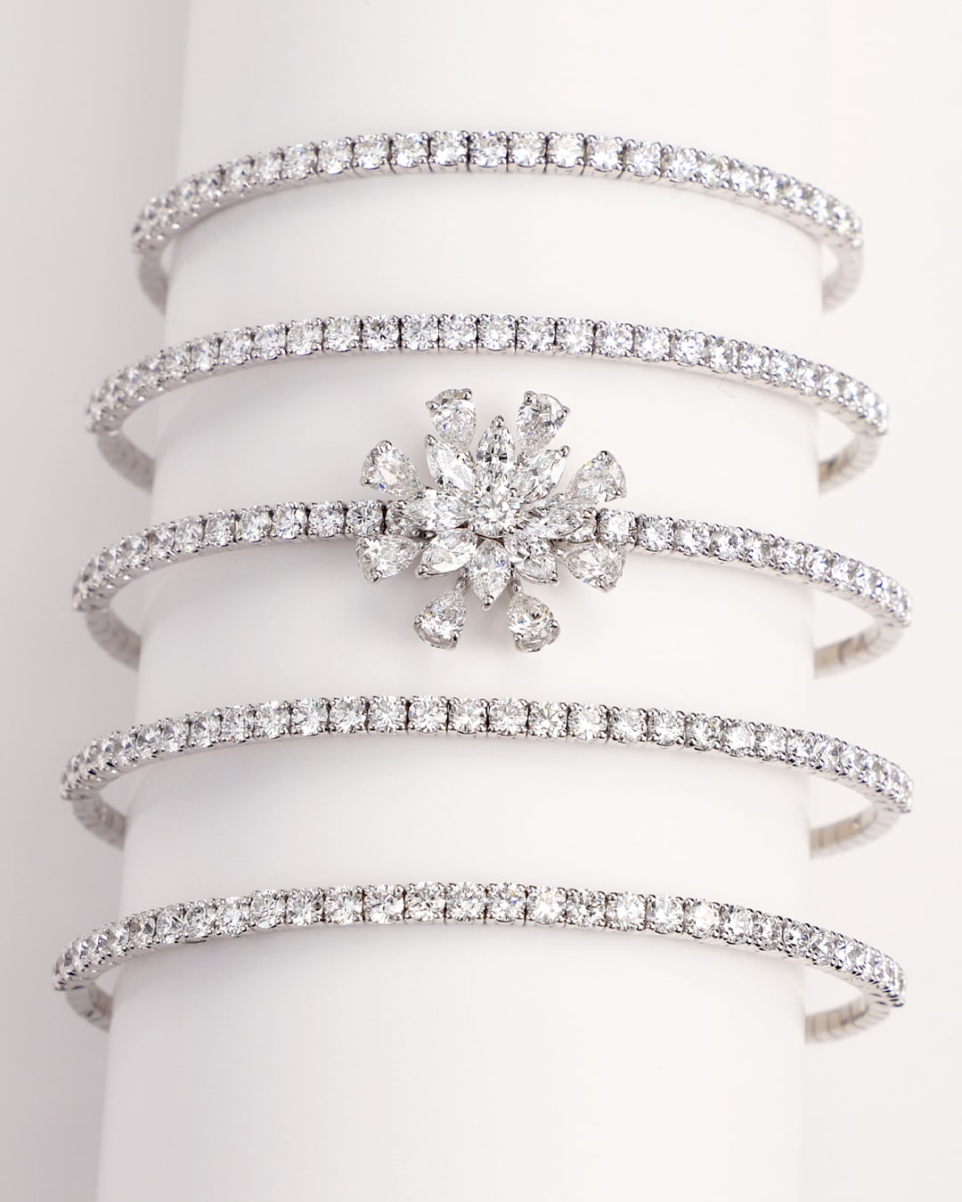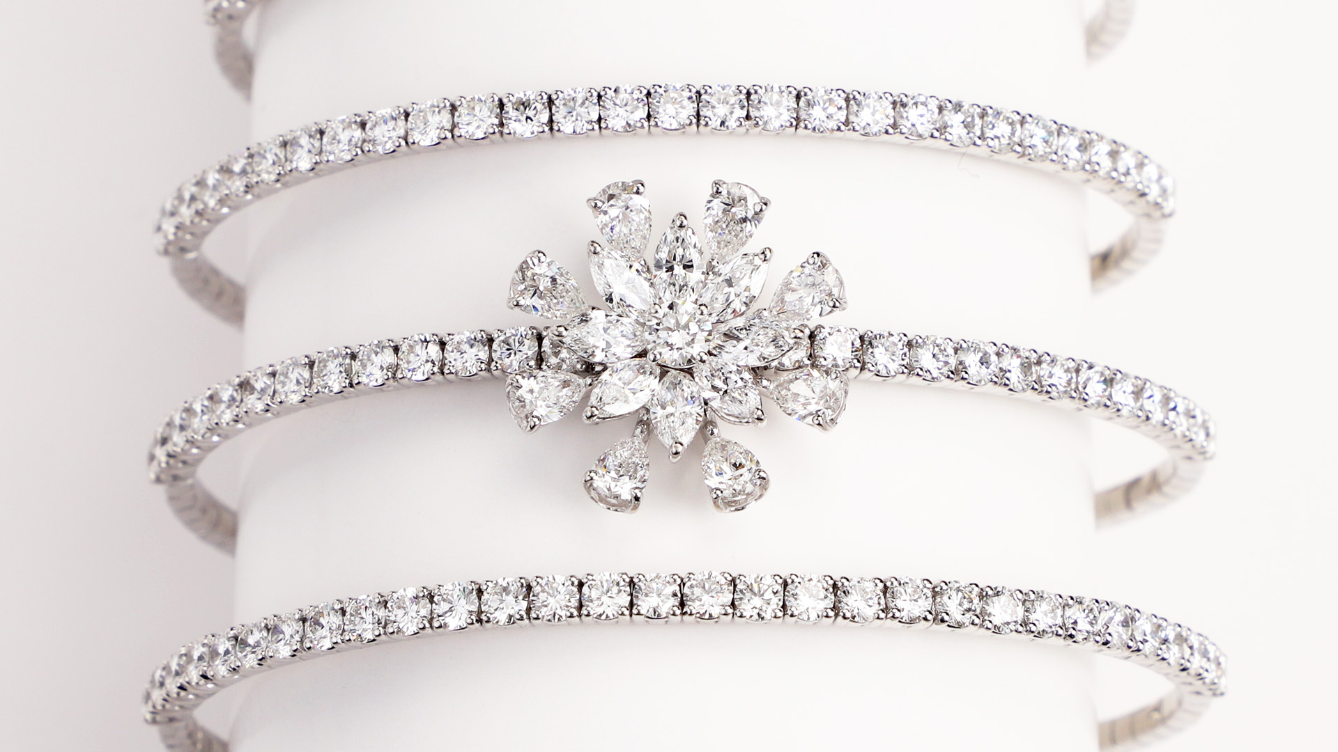 Five-ring slave bracelet in 18kt white gold, with a diamond flower that blooms like the final chord of a perfect melody: a symbol of strength, delicacy and lasting light.